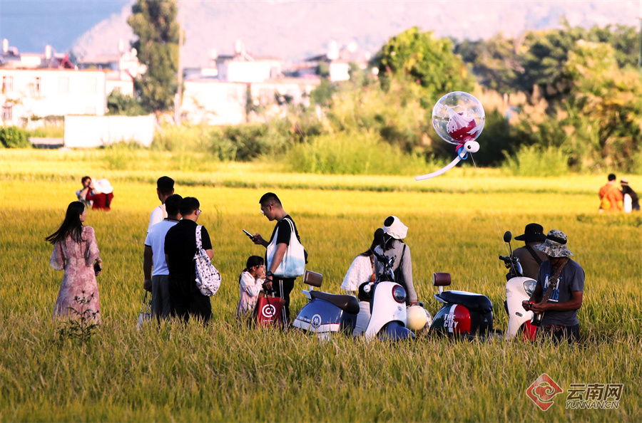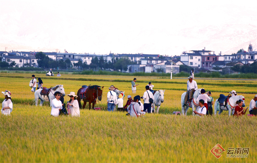 金秋十月,大理喜洲稻田一片金黄引来四方游客