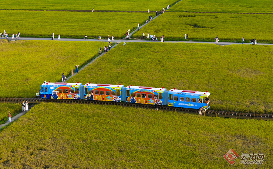“喜洲号”“有风号”小火车满载游客在稻田间穿行,形成独特的移动风景线。