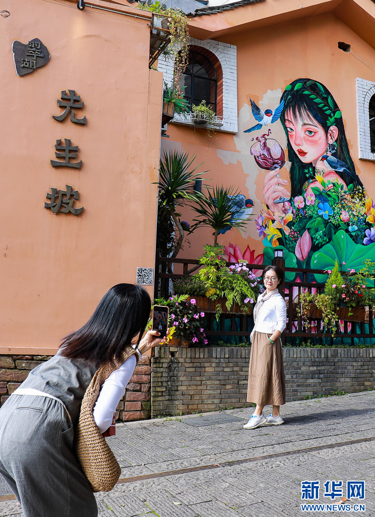 游客在昆明老街网红打卡墙拍照(10月4日摄)。新华网发(郑益 摄)