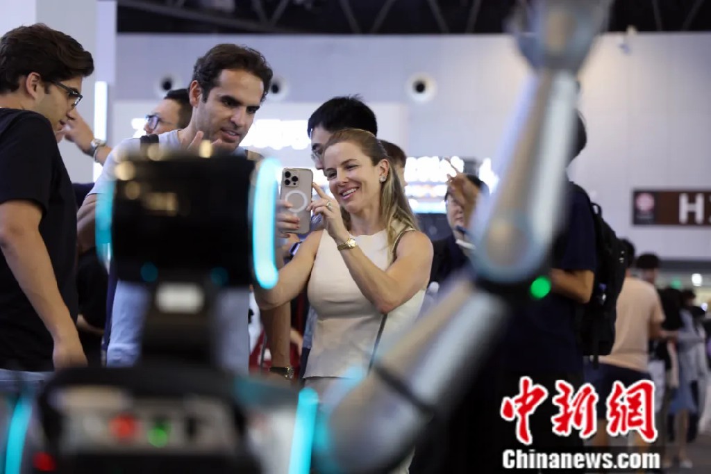2025年7月,在上海举办的2025世界人工智能大会上,一款中国制造的机器人吸引外国观众。中新社记者 汤彦俊 摄