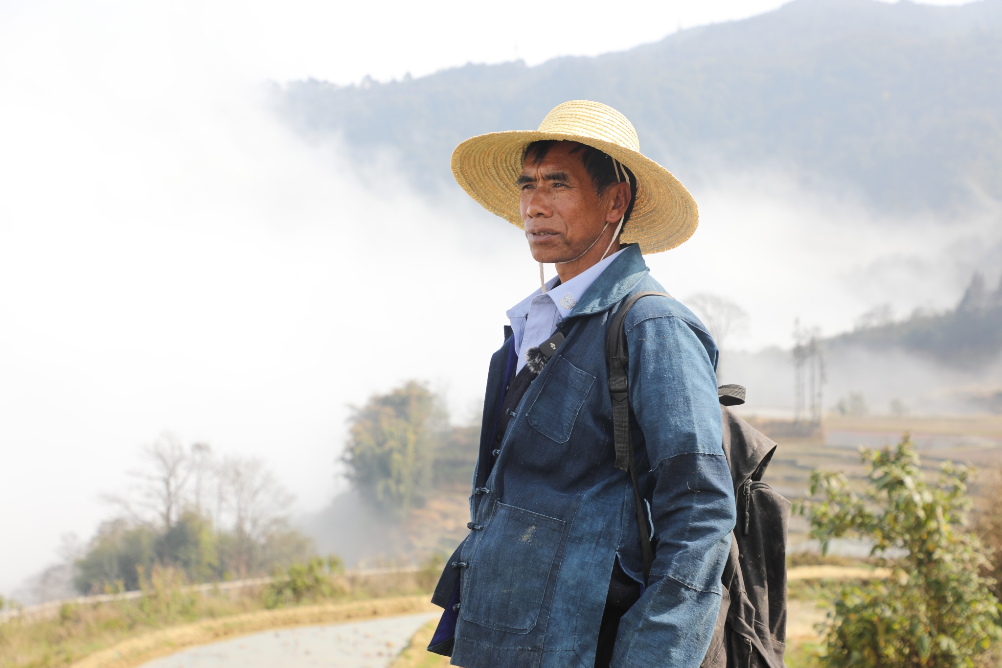 寒露过后,元阳县新街镇全福庄梯田在晨雾中苏醒。67岁的“赶沟人”卢志祥已背着双肩包、握着镰刀、扛着锄头开始了一天的巡护。包里的麻绳和油布,是他父亲传下的“吃饭家伙”,也是他守护梯田命脉的工具。