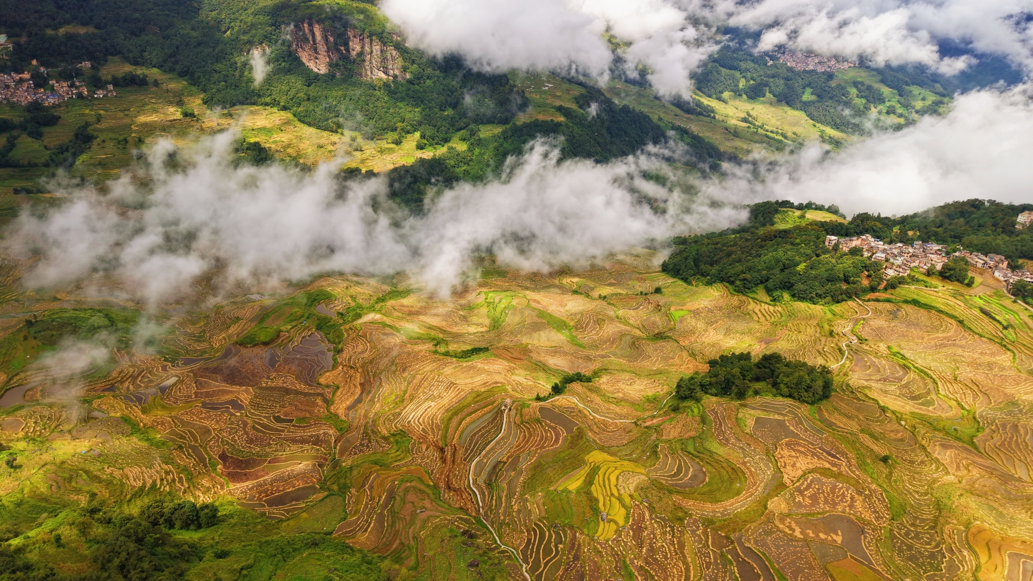 “四素”即森林、村寨、梯田、水系,它们在哀牢山上构成了一个精妙的循环系统:山顶的原始森林是天然的“绿色水库”,涵养的泉水与溪流通过沟渠系统,穿过村寨,流入梯田;水流携带着森林腐殖质与村寨养分,滋养作物后,经层层过滤汇入河流,最终蒸腾成云,复化为雨,回归森林。这一无需外部干预的自然循环,已持续上千年。