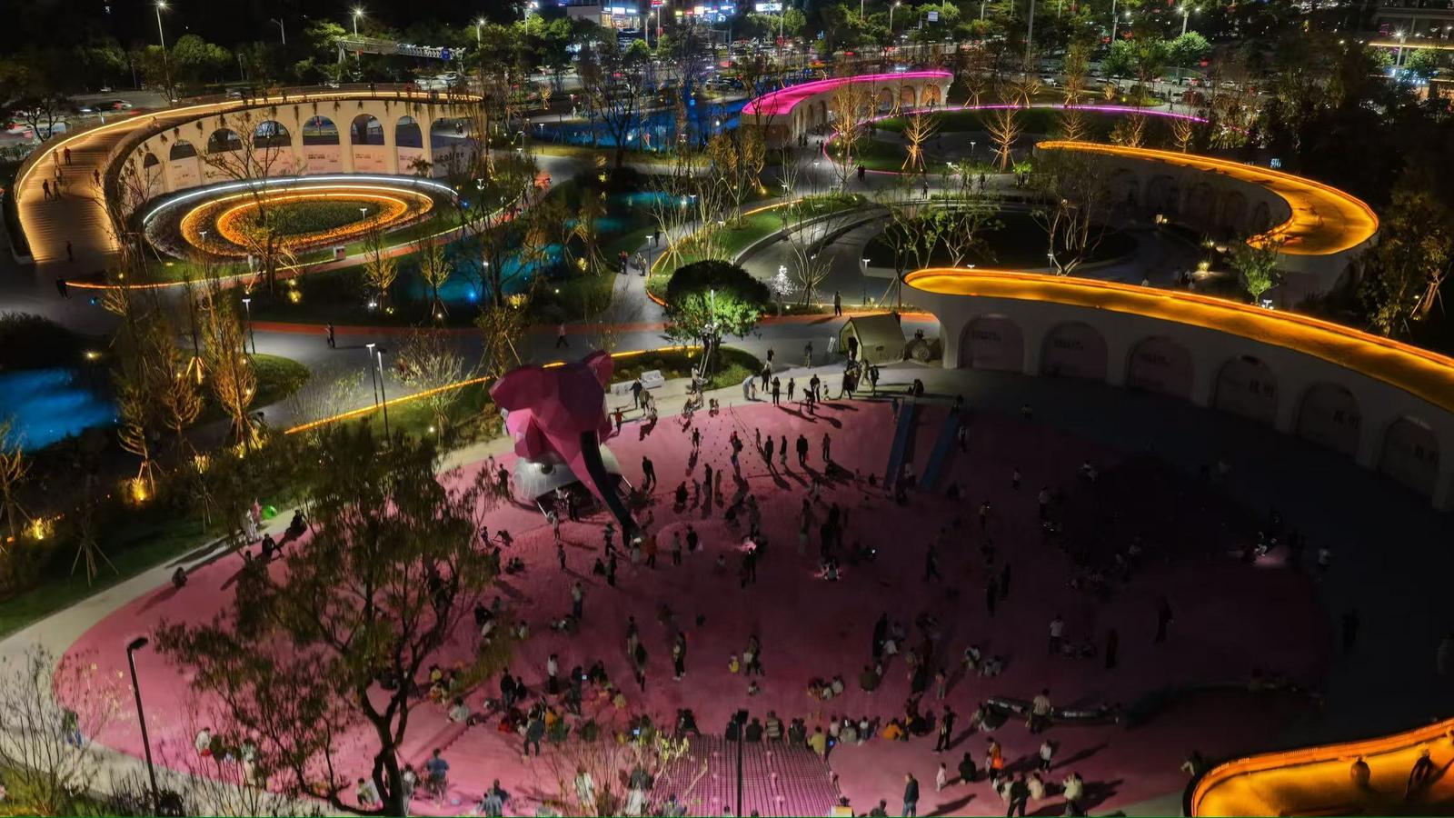 每日晚间7时,公园点亮如孔雀开屏般闪耀的璀璨灯带,给整座公园披上流动的霓裳,众多市民和儿童在此散步、嬉戏,一片热闹的场景成为巫家坝片区夜间最鲜活的生活图景。