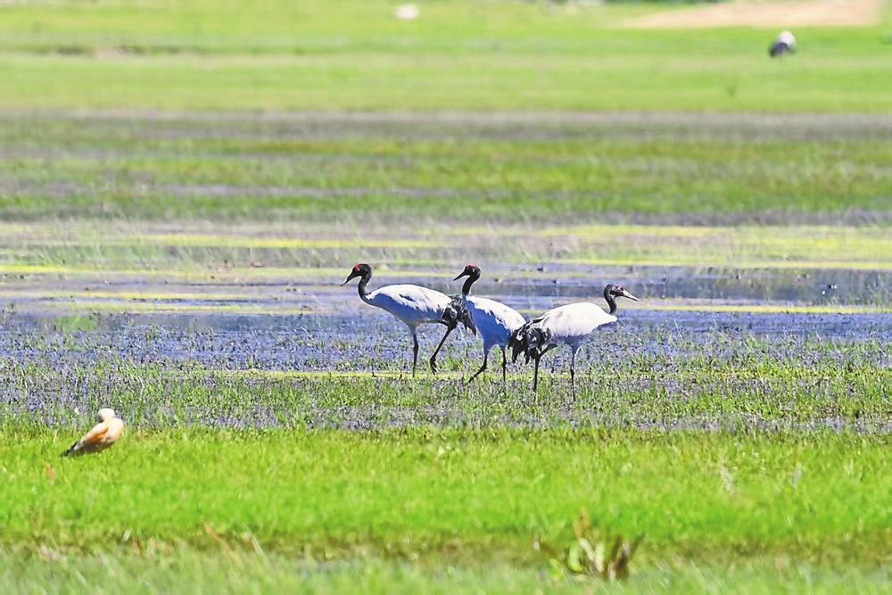 黑颈鹤在纳帕海湿地觅食。 通讯员陈志明/摄