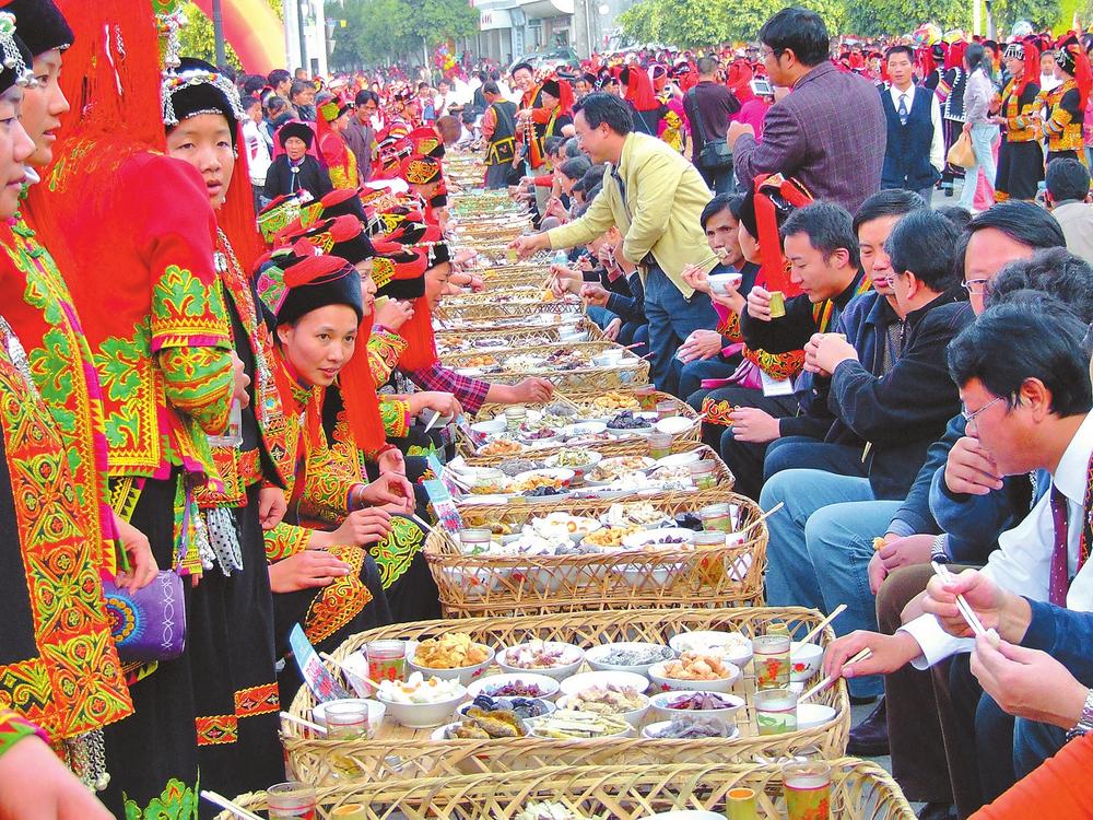 当哈尼梯田“褪去”金黄的盛装,结束了一年辛勤劳作的哈尼族村寨粮食满仓、鸡肥猪壮。在哈尼人期盼已久的十月年期间,家家户户会把好酒好菜搬上街头,篾桌一字排开,邀约八方宾客欢聚一堂,在长街古宴上共享美食、同庆丰收。