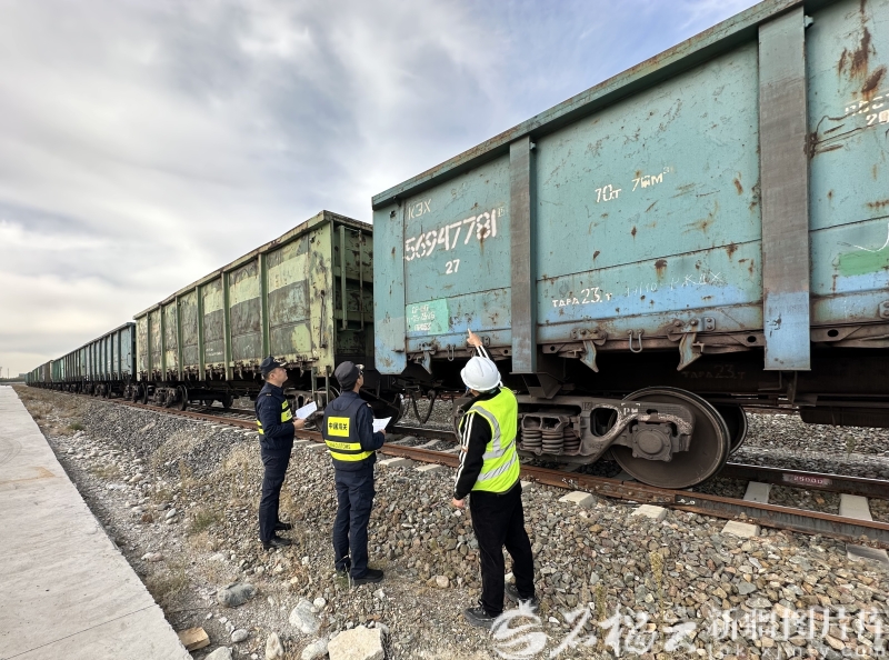 2024年12月5日,霍尔果斯国际边境合作中心海关关员在霍尔果斯综保区内验放通过铁路专用线运输的出口钢材。郑浩 摄