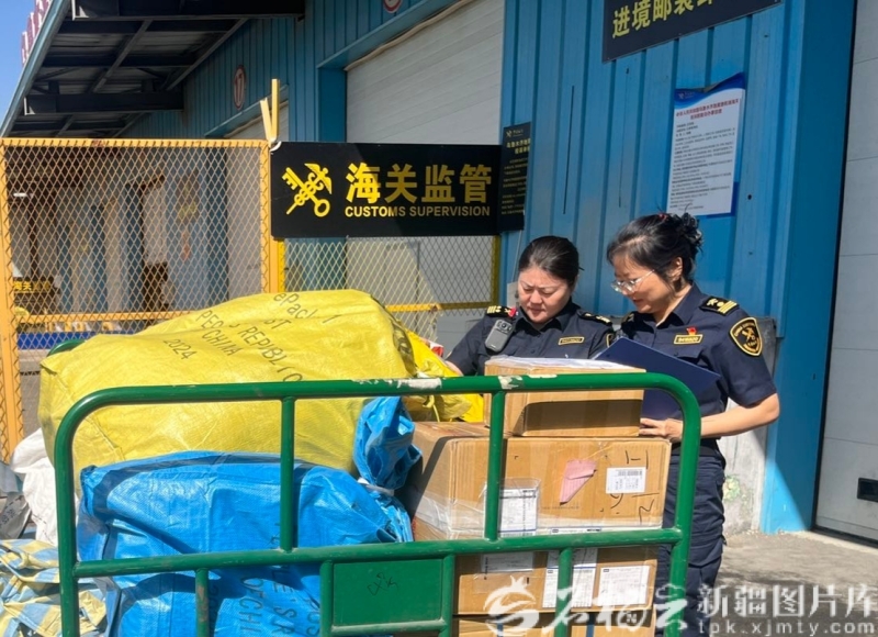 7月25日,乌鲁木齐天山机场海关关员对国际邮袋进行监管。高俊 摄