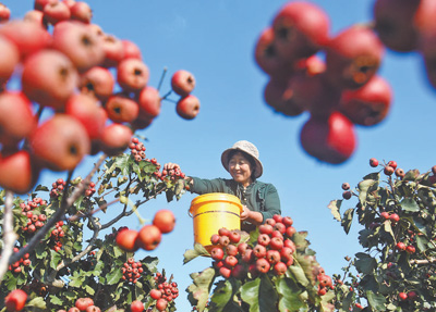 山东省淄博市沂源县悦庄镇崔家庄村,农民在采摘山楂。赵东山摄(影像中国)