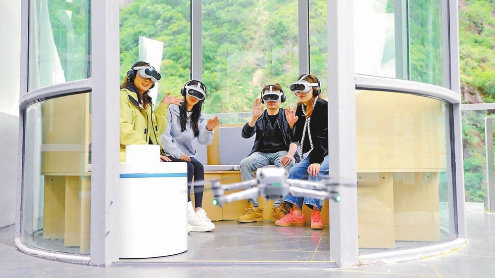 体验店内,游客正通过先进的AR设备,兴致勃勃地操控虚拟无人机,从独特视角俯瞰虎跳峡的雄奇险峻。体验者佩戴专用设备,仿佛自己驾驭无人机,穿梭于波涛汹涌的金沙江上空,近距离“触摸”巍然屹立的玉龙雪山和哈巴雪山,以超乎想象的视角将峡谷的深邃、江流的湍急、绝壁的陡峭尽收眼底。这种沉浸式、互动性的游览方式不仅打破了时间、空间与天气的限制,更让游客在保证安全的前提下,获得超越常规观景模式的震撼体验。“太神奇了,就像真的在飞一样,能从空中看到虎跳峡全貌,特别震撼。”刚结束体验的四川游客谢敏说,这种形式特别适合带孩子一起,既有趣又能直观地学习地理知识,感受大自然鬼斧神工的魅力。