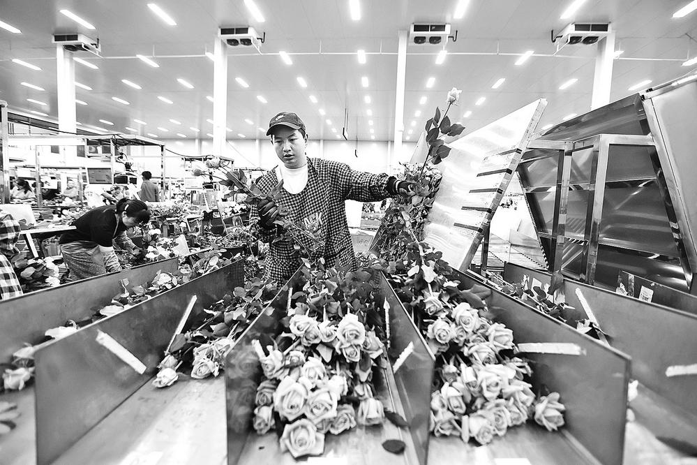 安宁市诺斯沃德花卉产业有限公司通过科技赋能,进一步提高鲜花分级的效率和质量,节省了人工成本,提升了生产效益,以创新科技助力云花产业。图为工作人员正在通过智能设备分拣鲜切花。春城晚报记者陈飞/摄
