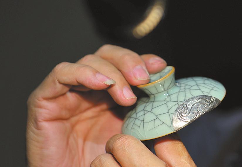 錾刻花纹的银片与铜丝逐渐让残缺的杯盖重获新生。