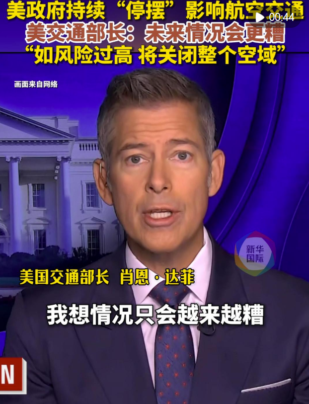 美国交通部长肖恩·达菲3日接受媒体采访时说,未来情况会越来越糟,很多空管人员已经一个多月没领到薪水,他们正面临选择:是想办法解决家人温饱,还是继续为政府无偿工作。
