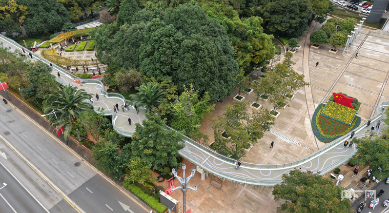 翠湖城市绿道南起五华广场一侧人民路过街天桥,途经五华广场、五一路,北至黄公东街新建公园北口,由黄公东街市政公园及架空栈道两部分组成。绿道采用轻质架空结构设计,并同步实施沿线景观提升工程,为市民、游客提供一条内容丰富、充满生趣的慢行游赏路径。市民漫步栈道,可俯瞰人民中路城市风貌,也可在蓝花楹盛开的季节邂逅黄公东街的紫色浪漫。