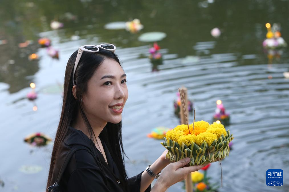 当日是泰国传统节日水灯节,泰国民众前往河流沿岸施放水灯,许愿祈福。