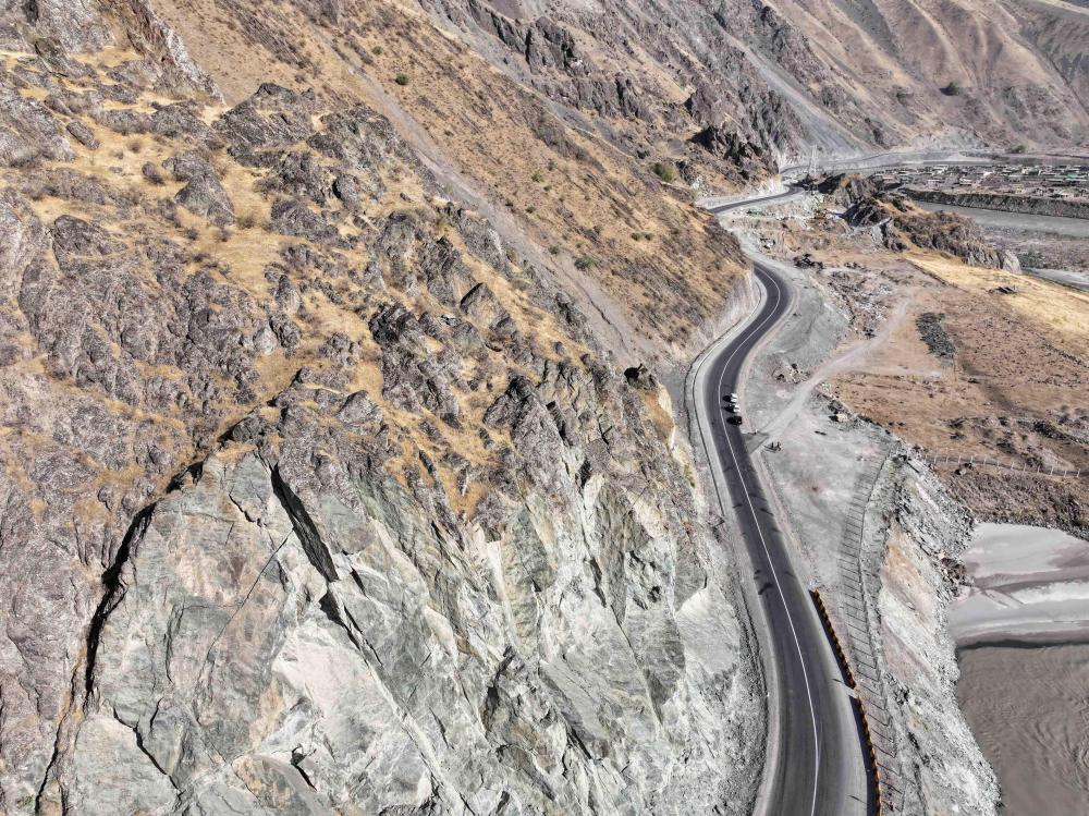 这是在塔吉克斯坦卡拉依洪姆村附近拍摄的中塔公路二期路段(无人机照片)。