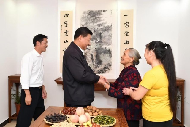 2019年9月16日至18日,中共中央总书记、国家主席、中央军委主席习近平在河南考察。这是16日下午,习近平在信阳市新县田铺乡田铺大塆“老家寒舍”民宿店,同店主一家亲切交谈。新华社记者 谢环驰 摄