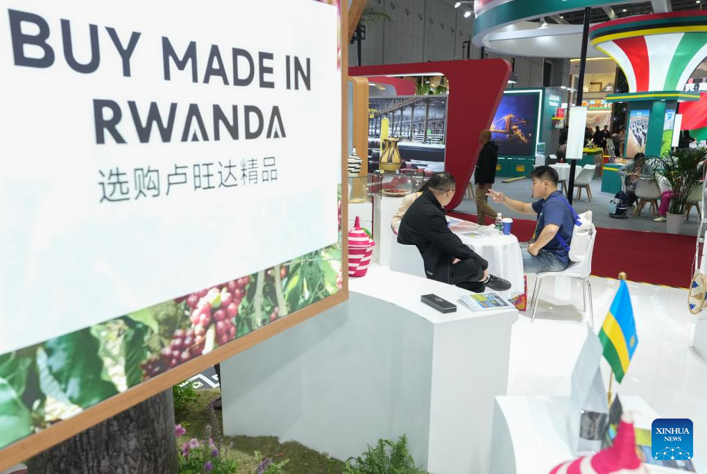 People communicate with each other at the pavilion of Rwanda during the eighth China International Import Expo (CIIE) in east China's Shanghai, Nov. 7, 2025. The eighth CIIE opened here on Wednesday. Enterprises from a total of 123 Belt and Road partner countries participated in this year's CIIE, increasing by 23.1 percent year on year. (Xinhua/Ren Pengfei)