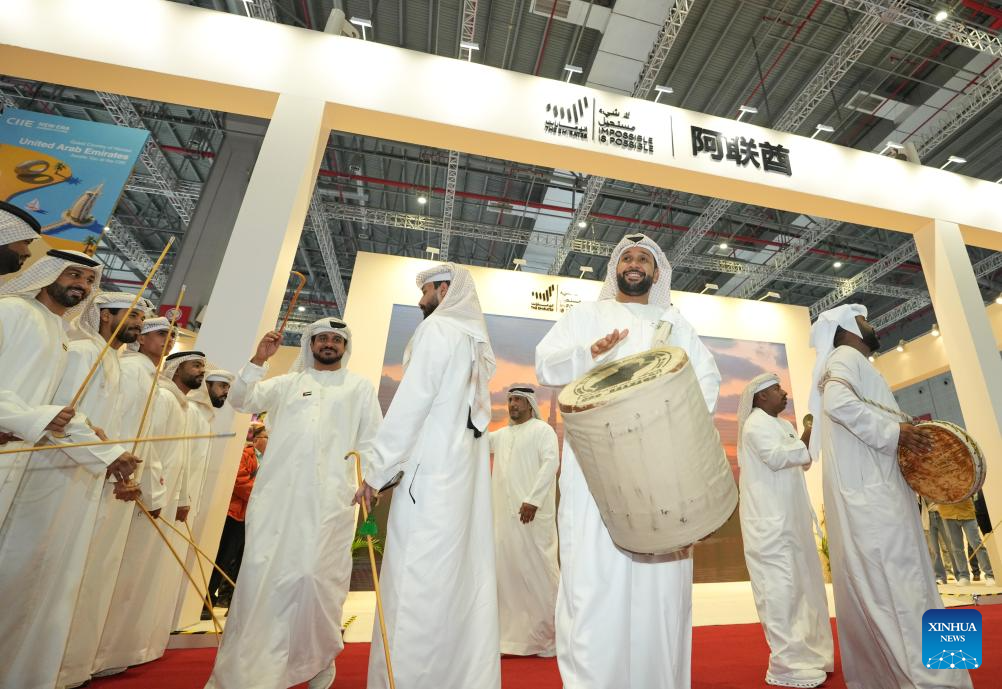 Staff members perform at the pavilion of the United Arab Emirates during the eighth China International Import Expo (CIIE) in east China's Shanghai, Nov. 7, 2025. The eighth CIIE opened here on Wednesday. Enterprises from a total of 123 Belt and Road partner countries participated in this year's CIIE, increasing by 23.1 percent year on year. (Xinhua/Ren Pengfei)