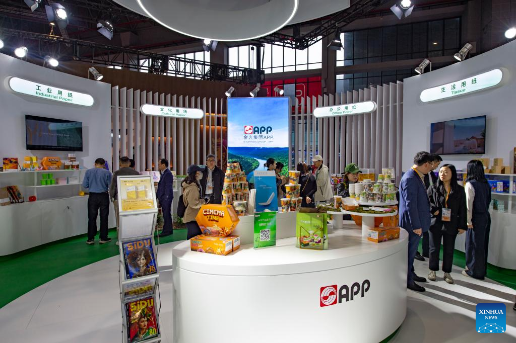 People visit the booth of Indonesia's conglomerate Sinar Mas at the Consumer Goods exhibition area of the eighth China International Import Expo (CIIE) in east China's Shanghai, Nov. 7, 2025. The eighth CIIE opened here on Wednesday. Enterprises from a total of 123 Belt and Road partner countries participated in this year's CIIE, increasing by 23.1 percent year on year. (Xinhua/Ding He)