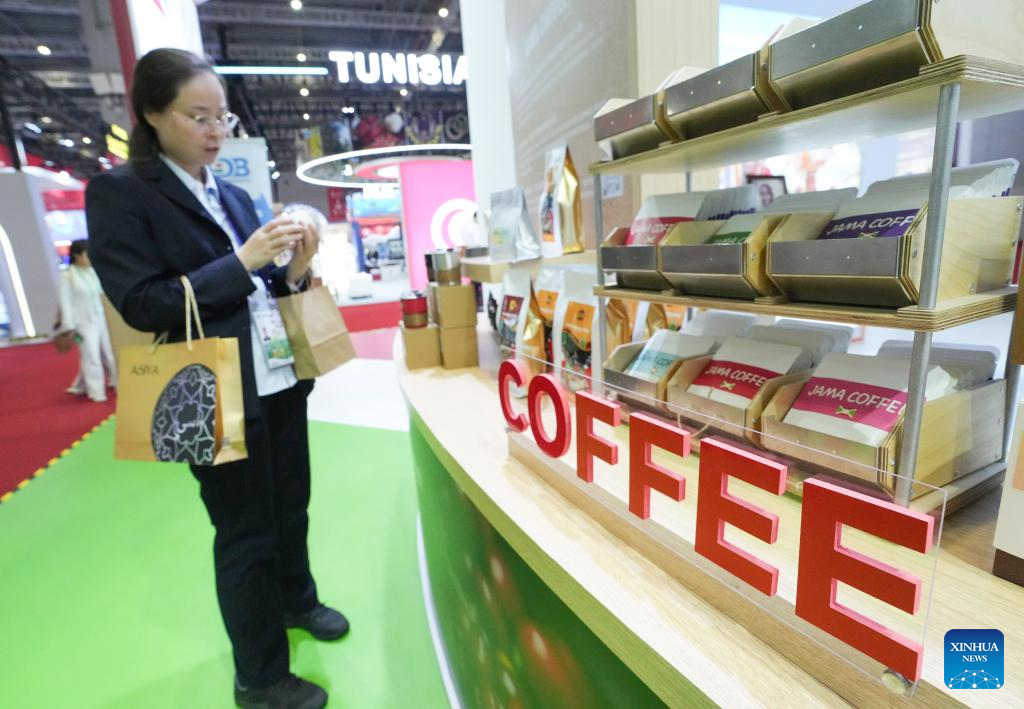 Visitors try coffee at the pavilion of Ethiopia during the eighth China International Import Expo (CIIE) in east China's Shanghai, Nov. 7, 2025. The eighth CIIE opened here on Wednesday. Enterprises from a total of 123 Belt and Road partner countries participated in this year's CIIE, increasing by 23.1 percent year on year. (Xinhua/Meng Chenguang)