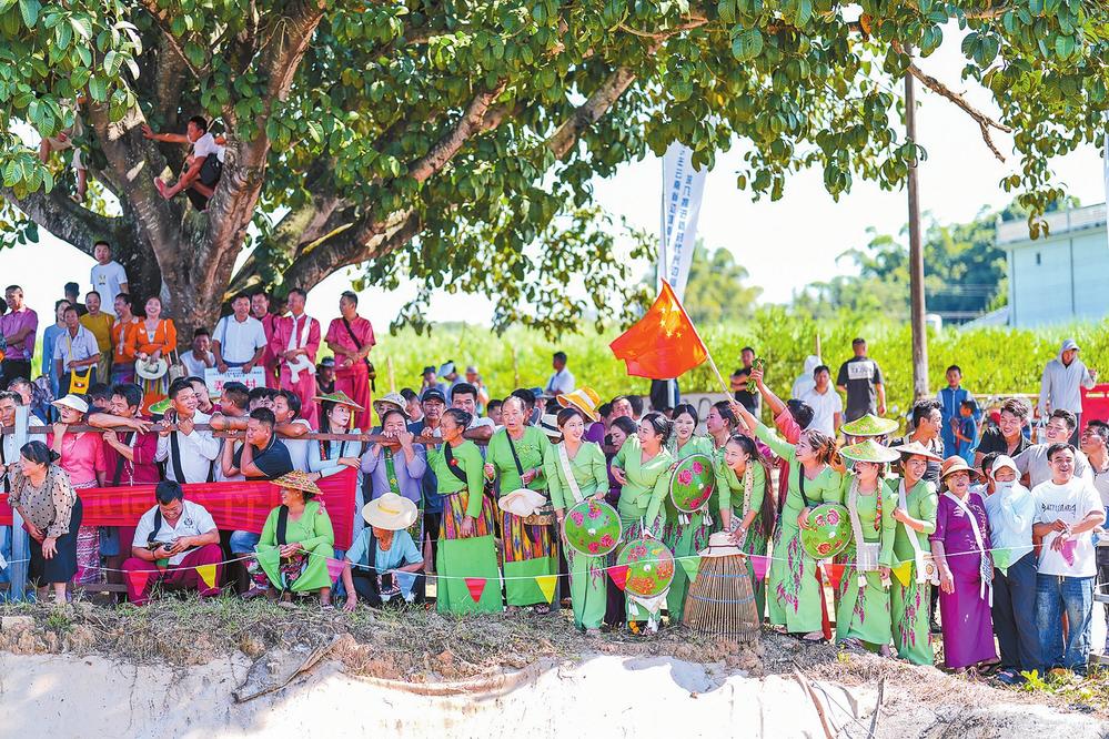陇川县弄贯村村民为竹筏、罩鱼比赛加油。通讯员张筱婕/摄