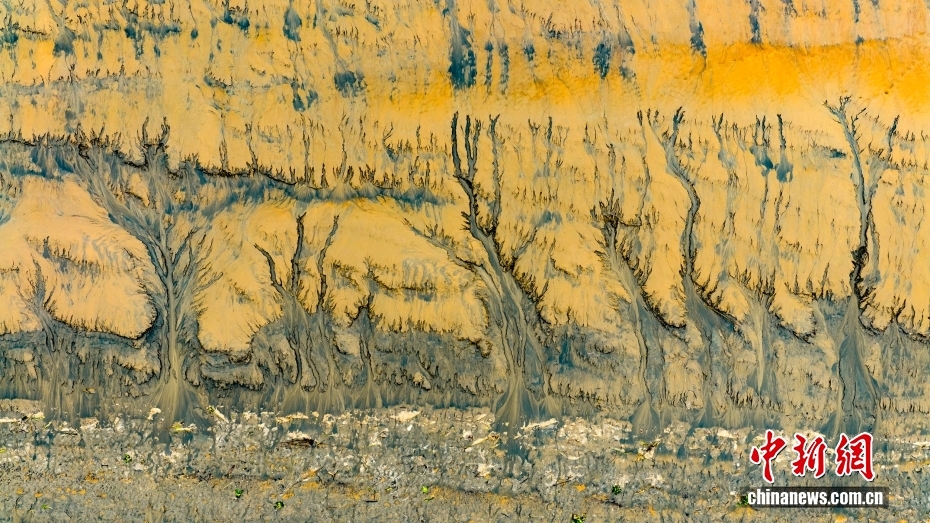 11月8日,浙江省海宁市钱塘江滩壮美的“潮汐树”景观。在钱塘江潮水冲刷影响下,一株株“树干”粗壮、形态栩栩如生的“潮汐树",宛如一幅生动的大地艺术画卷,令人叹为观止。