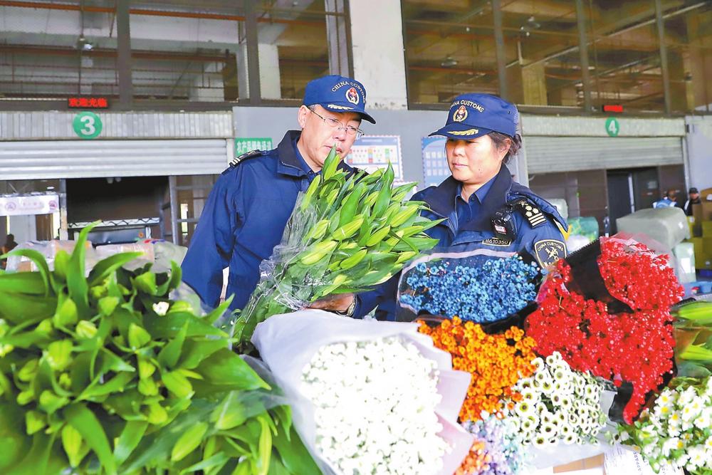 海关关员在昆明机场口岸查验即将出口的鲜切花。