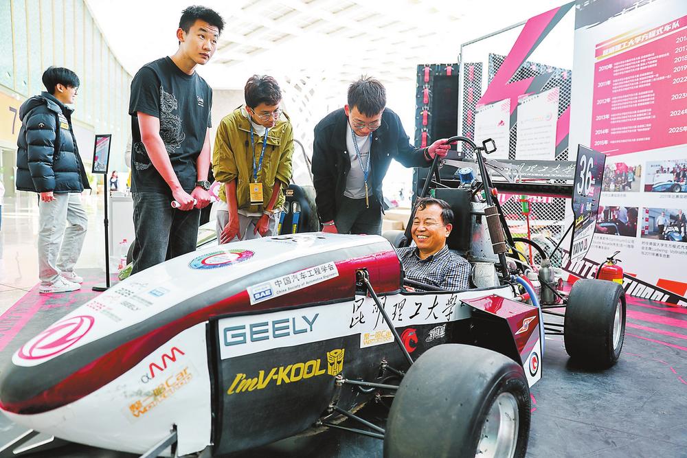 市民在车展上体验昆明理工大学KMUST方程式车队独立自主设计、制造、调试的方程式赛车。