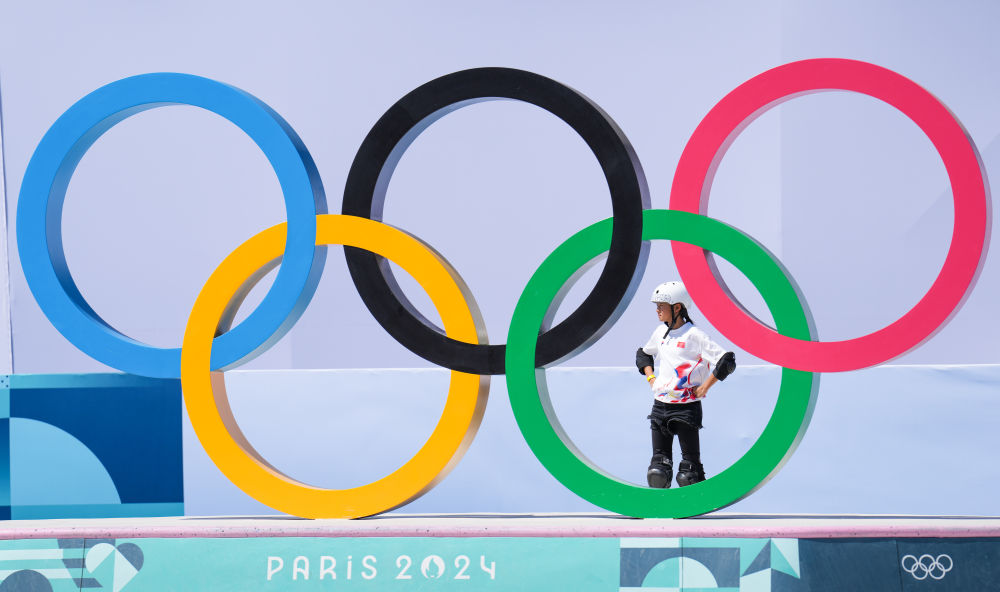 2024年8月6日,巴黎奥运会滑板女子碗池预赛在巴黎协和广场举行,中国选手郑好好在比赛中。新华社记者 杜宇 摄