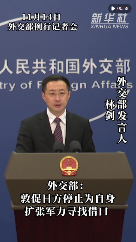 新华社北京11月14日电(记者董雪、刘杨)外交部发言人林剑11月14日表示,中方对日方近期军事安全动向感到严重关切,敦促日方停止为自身扩张军力寻找借口。