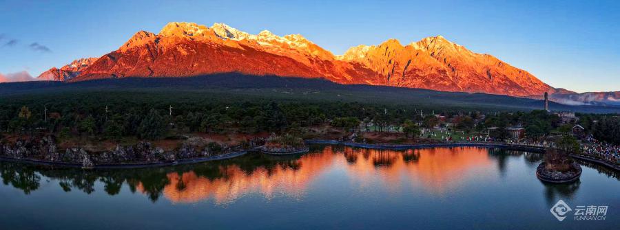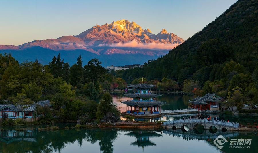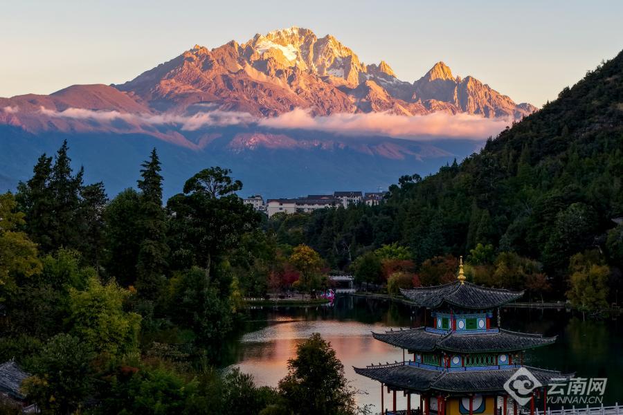在丽江,观赏“日照金山”的地点众多。甘海子、蓝月谷等地可近距离感受雪山的巍峨壮丽;狮子山观景台能俯瞰古城、遥望雪山;而黑龙潭公园则是摄影师钟爱的经典机位——金色的山峰倒映潭中,与亭台楼阁相映成趣,“双份”美景令人沉醉。