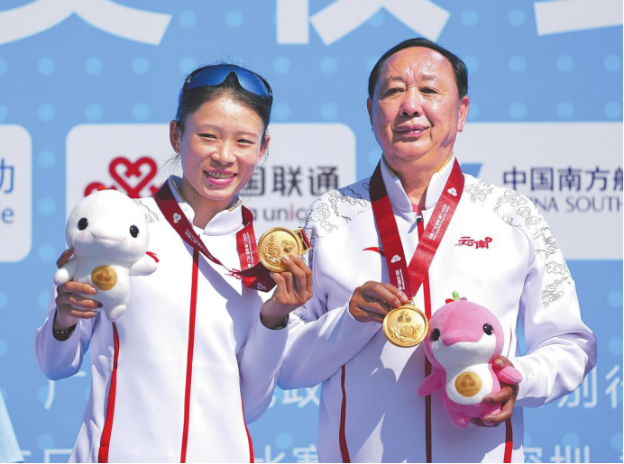 田径项目女子马拉松冠军、云南队选手张德顺(左)和她的教练员在颁奖仪式上 新华社记者 江汉 摄