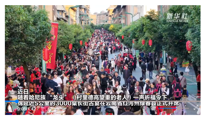 近日,随着哈尼族“龙头”一声祈福令下,绵延近5公里的3000桌长街古宴在云南省红河州绿春县正式开席,万人同席、举杯共饮的壮观场景,吸引了众多游客和当地群众参与。