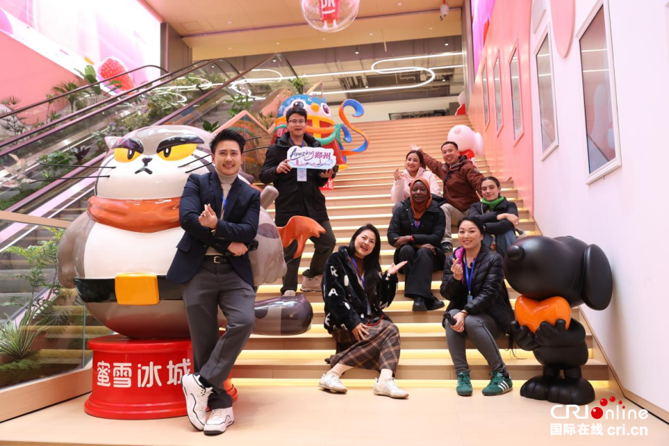 老挝网红王伟(右四)与网红博主打卡郑州中欧班列集结调度指挥中心