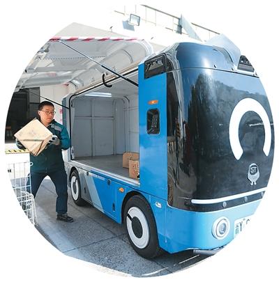11月11日,中国邮政集团有限公司扬州市分公司的快递员将快递包裹搬运至无人驾驶快递车上。孟德龙摄(人民视觉)