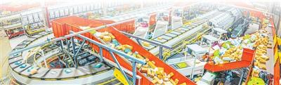 11月7日,江苏省宿迁市宿城区申通快递分拨中心灯火通明,工作人员在智能分拣流水线上分拣快递包裹。徐江海摄(人民视觉)