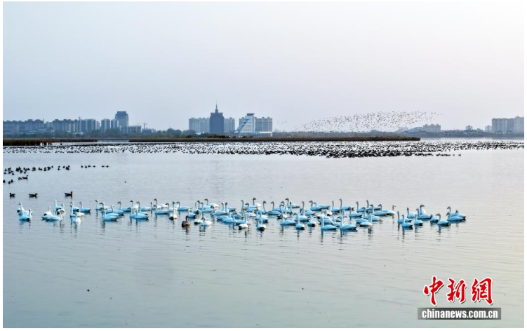 11月23日,河北衡水湖国家级自然保护区出现罕见生态景观:近百只国家二级保护动物小天鹅在湖面嬉戏,近万只豆雁列队翱翔,千余只花脸鸭形成的“鸟浪”翻飞涌动,三种候鸟景象大规模同框。专家表示,三种候鸟习性不同,同期集中出现实属难得,印证了湿地生态环境的显著改善。衡水湖作为东亚—澳大利西亚候鸟迁徙要道,目前记录鸟类达336种,已成为候鸟重要越冬栖息地。图为11月23日,小天鹅在衡水湖湖面上游弋嬉戏,不远处的豆雁或振翅欲飞,或追逐嬉戏。