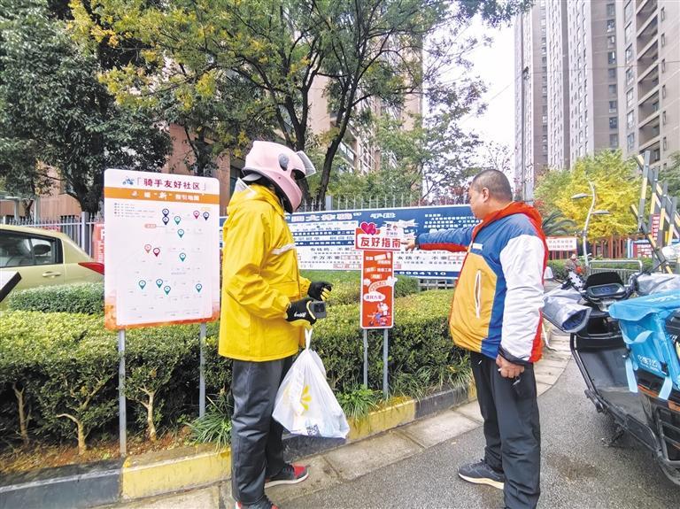 在织密服务网络的同时,白石江街道着力推动“双向赋能”,引导新就业群体从“治理对象”转化为“治理力量”。通过在“小哥”密集区设置停车区与导视图,安排佩戴“哥俩好”徽章的保安担任“流动向导”,并在驿站设立“心愿墙”收集需求,实现服务精准对接。同时,积极发挥“小哥”们在走街串巷中的优势,鼓励他们通过物业设立的“信息征集贴”反馈异常情况,参与社区治理。目前已识别出5户独居老人等重点关注群体,形成“小哥发现上报、社区联动解决”的治理闭环,实现服务与治理的深度融合。