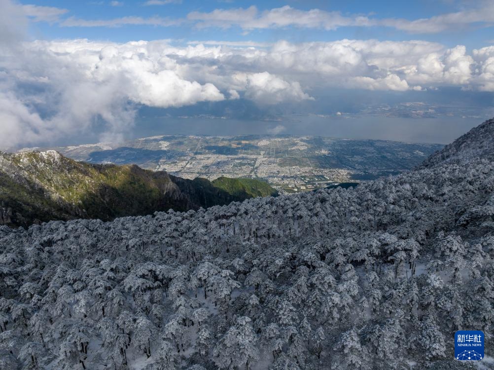 受冷空气影响,云南大理苍山迎来2025年入冬后的首场降雪。银装素裹的山林与山脚下的洱海、古城相映成趣,构成一幅水墨画卷。(罗铸摄)