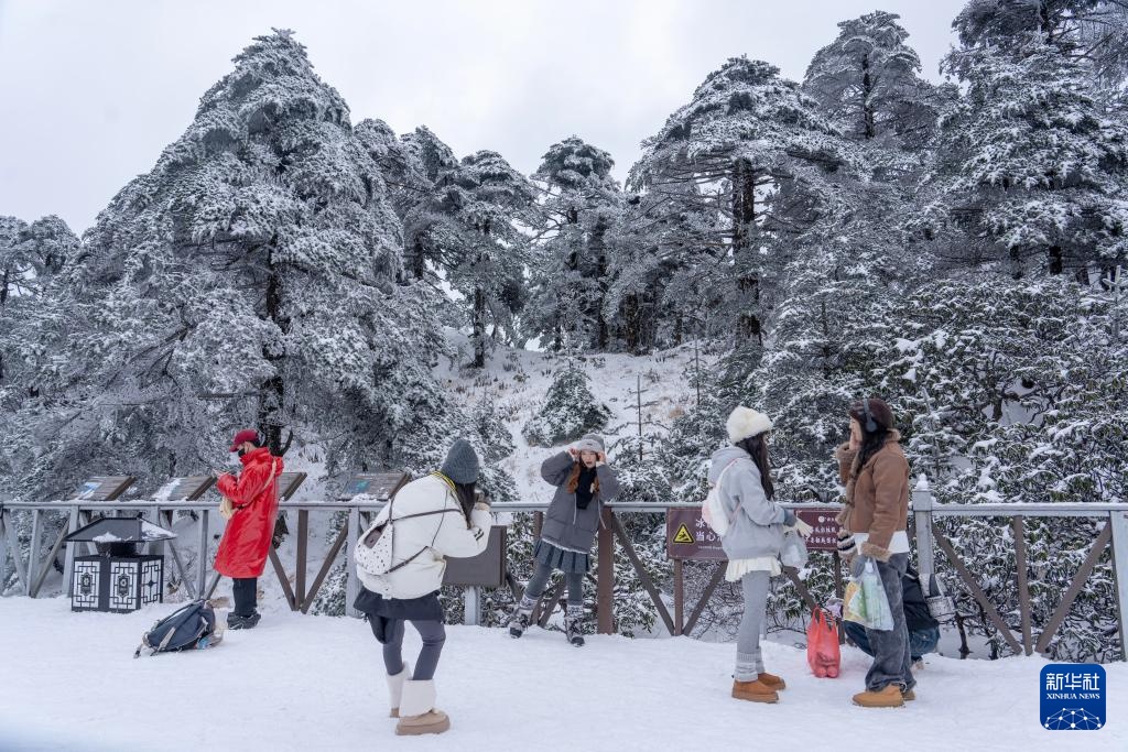 11月24日,游客在云南大理苍山景区雪景中拍照留念。