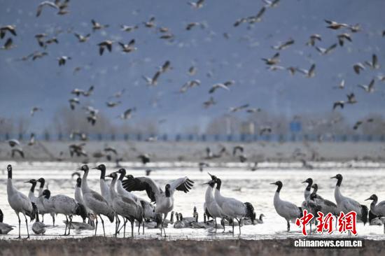 11月26日,位于西藏自治区拉萨市林周县的黑颈鹤自然保护区内,大量越冬的黑颈鹤在卡孜水库、农田、湿地里觅食、嬉戏。林周县位于拉萨河上游及澎波河流域,是黑颈鹤的主要越冬地之一。