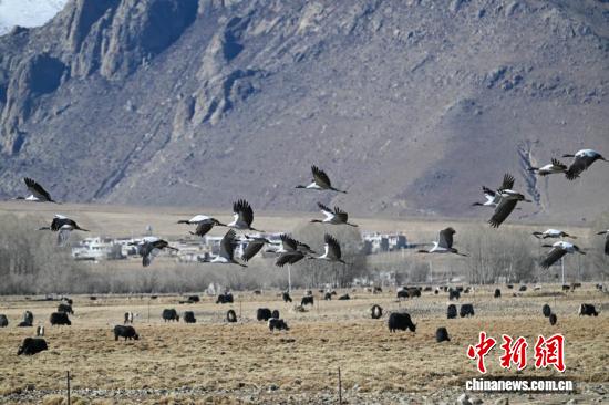 西藏:越冬黑颈鹤“做客”林周 绘就生态乐园