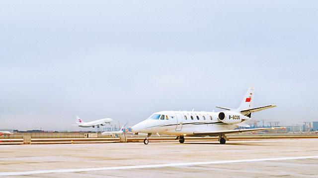 图为在落地校验科目中,B-603S校飞飞机平稳降落在新建东二跑道上。