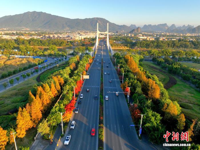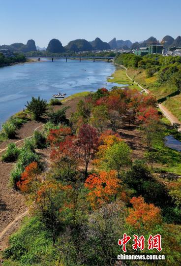 图为桂林市南洲桥头枫香、水杉红艳似火。(无人机照片)李腾钊 摄