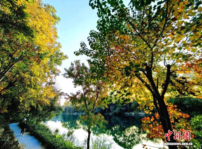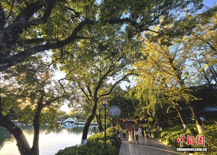 图为桂林市榕湖边上的银杏和榔榆在夕阳映照下美不胜收。李腾钊 摄