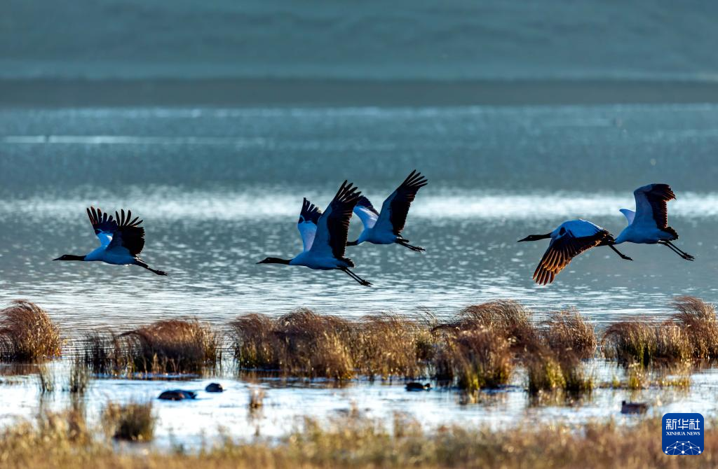 11月30日,黑颈鹤在大山包黑颈鹤国家级自然保护区内的大海子湿地飞舞。新华社发(范晖/摄)