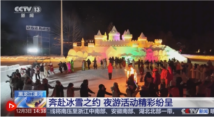 央视网消息:立冬以来,天气逐渐寒冷,冬天的到来让各地游客奔赴冰雪之约的热情高涨起来。地处我国最北端的黑龙江漠河市,夜间气温已降至零下30摄氏度左右。游客们除了白天能欣赏到北国风光,夜幕下的漠河也是灯火璀璨,滑雪、跳舞、赏雪雕等各类活动精彩纷呈。