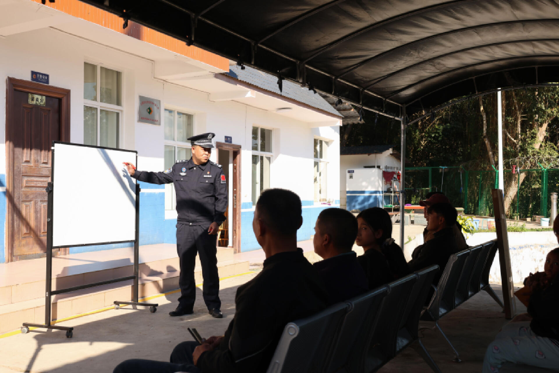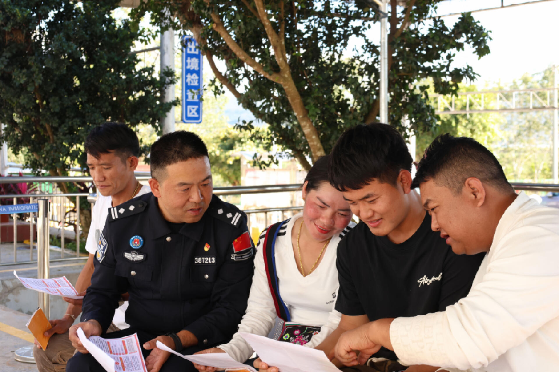 2025年12月4日,是第十二个国家宪法日,磨憨出入境边防检查站勐润分站“双语普法宣传队”在口岸向入境的老挝籍旅客发放中老双语宣传单,讲解《宪法》知识。