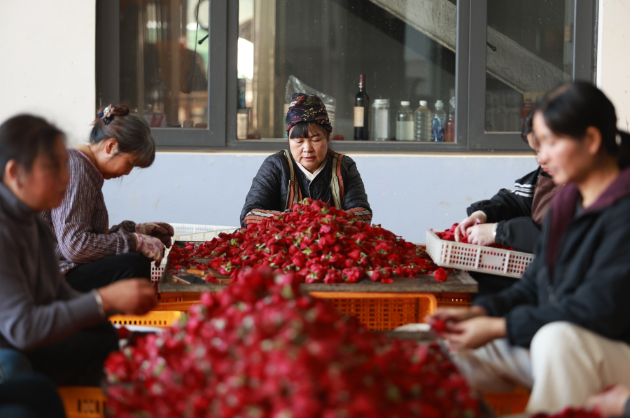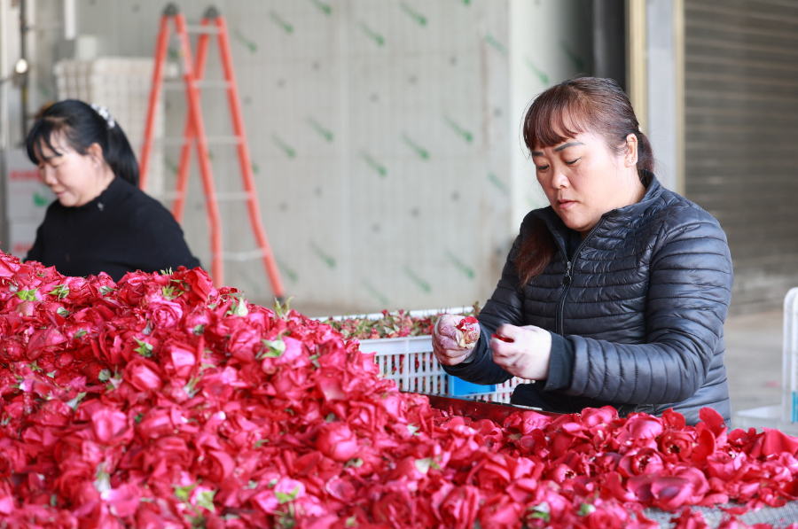 小河边村村民在分拣玫瑰花。高吴双 摄