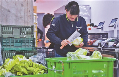 ▲为满足不同消费者,北京永辉超市百子湾路店结账区外还有成包销售的白菜、大葱
